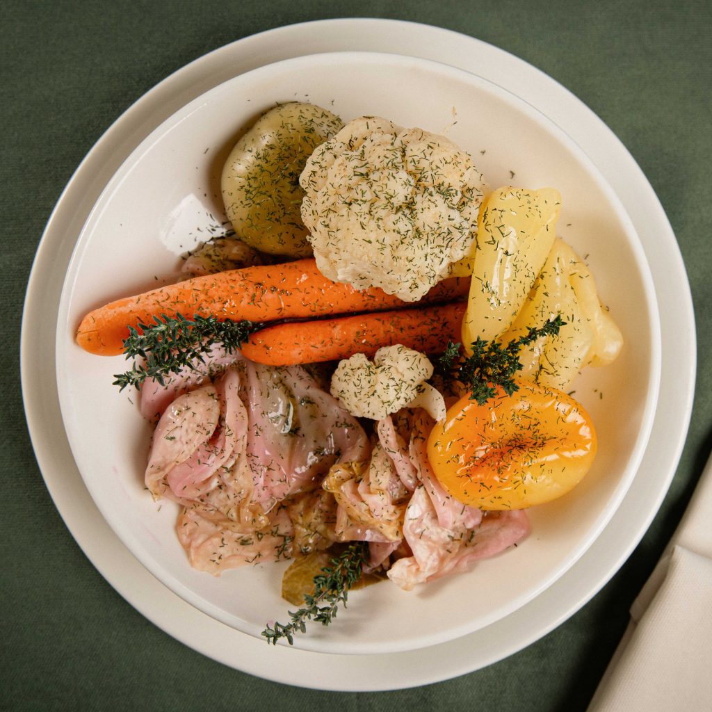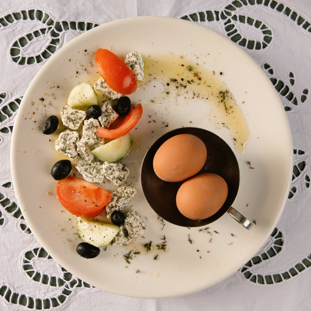 Fried farm eggs, homemade ‘suxhuk’ sausage, homemade cheese, vegetables or pickles.
