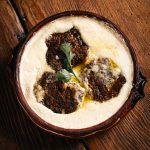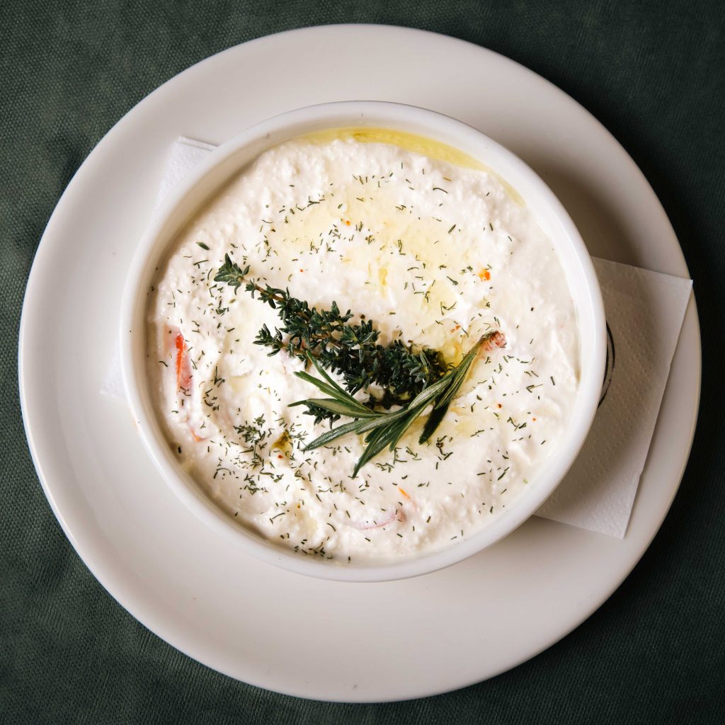 Lamb and veal meat, kaymak, onions, dill, parsley.