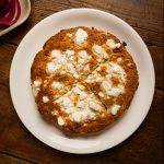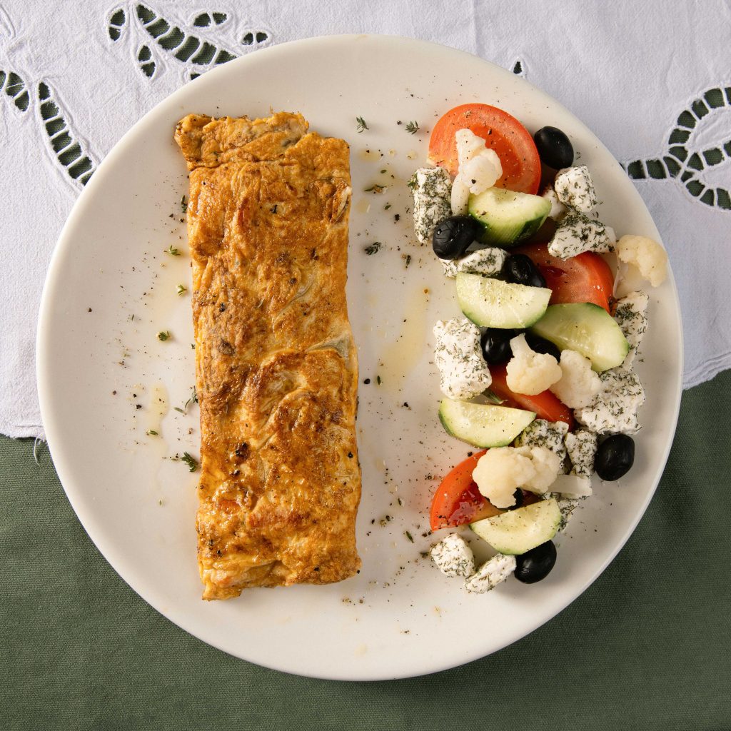 Omletë, djathë i shtëpisë, perime ose turshi.