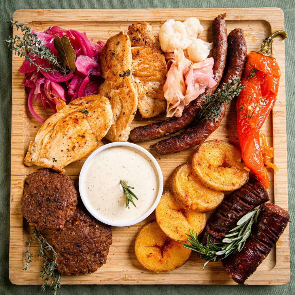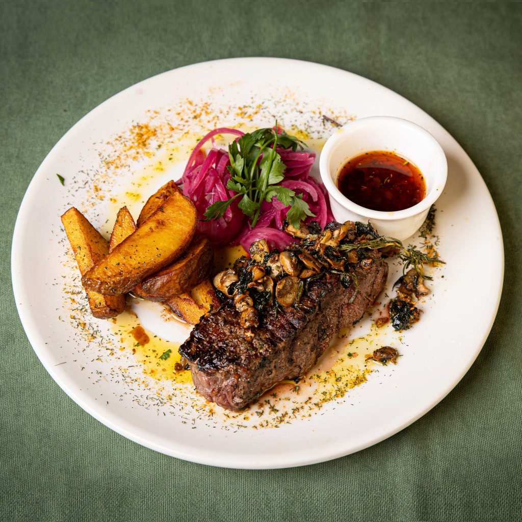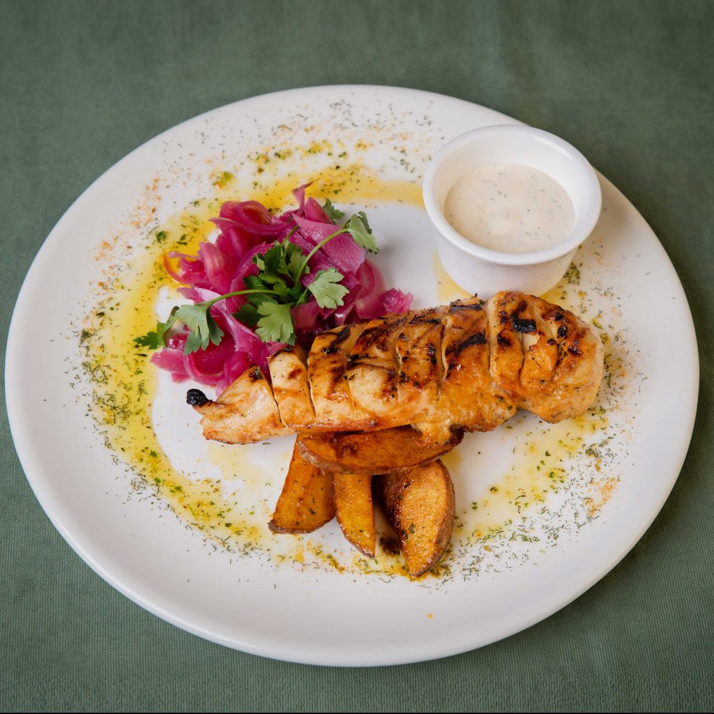 Served with roasted potatoes, homemade sauce, and fermented onions