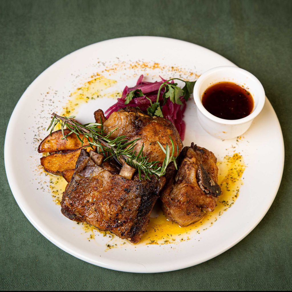 Served with potatoes roasted on embers, homemade sauce, and fermented onions