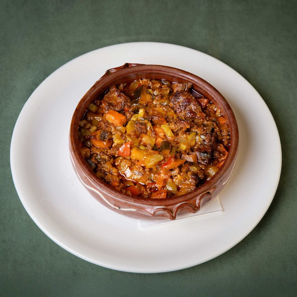 Minced meat mixed with fresh vegetables, tomatoes, and traditional spices, baked in the oven and served in a clay dish — a typical recipe from the city of Gjakova.