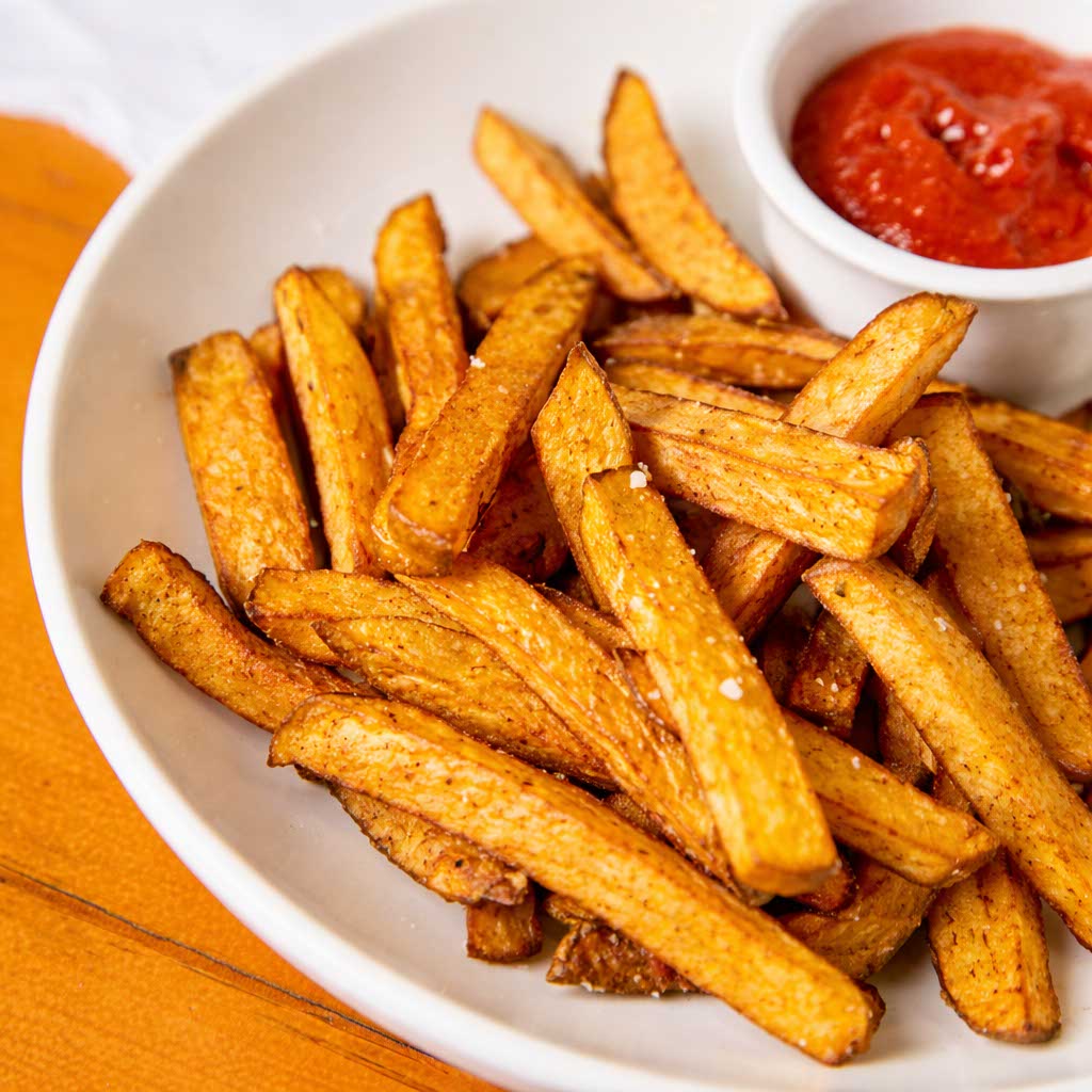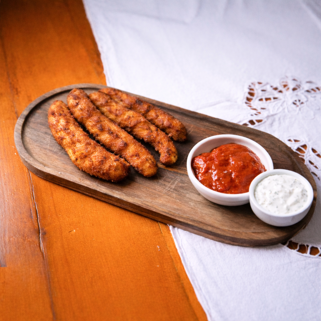 Served with white sauce or ketchup.