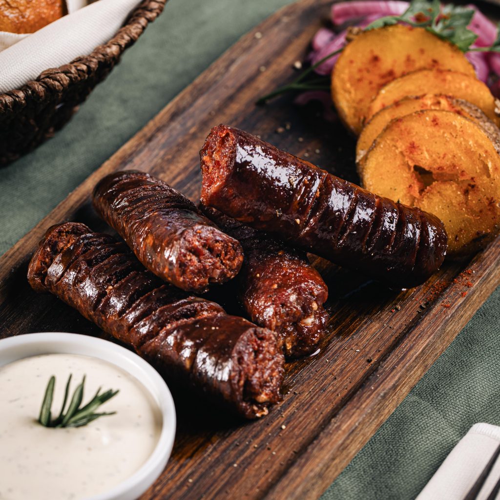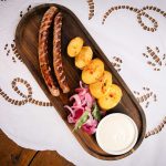 Shërbehet dy salçiçe (virshlle) me patate të pjekura, salcë shtëpie dhe qepë të fermentuara